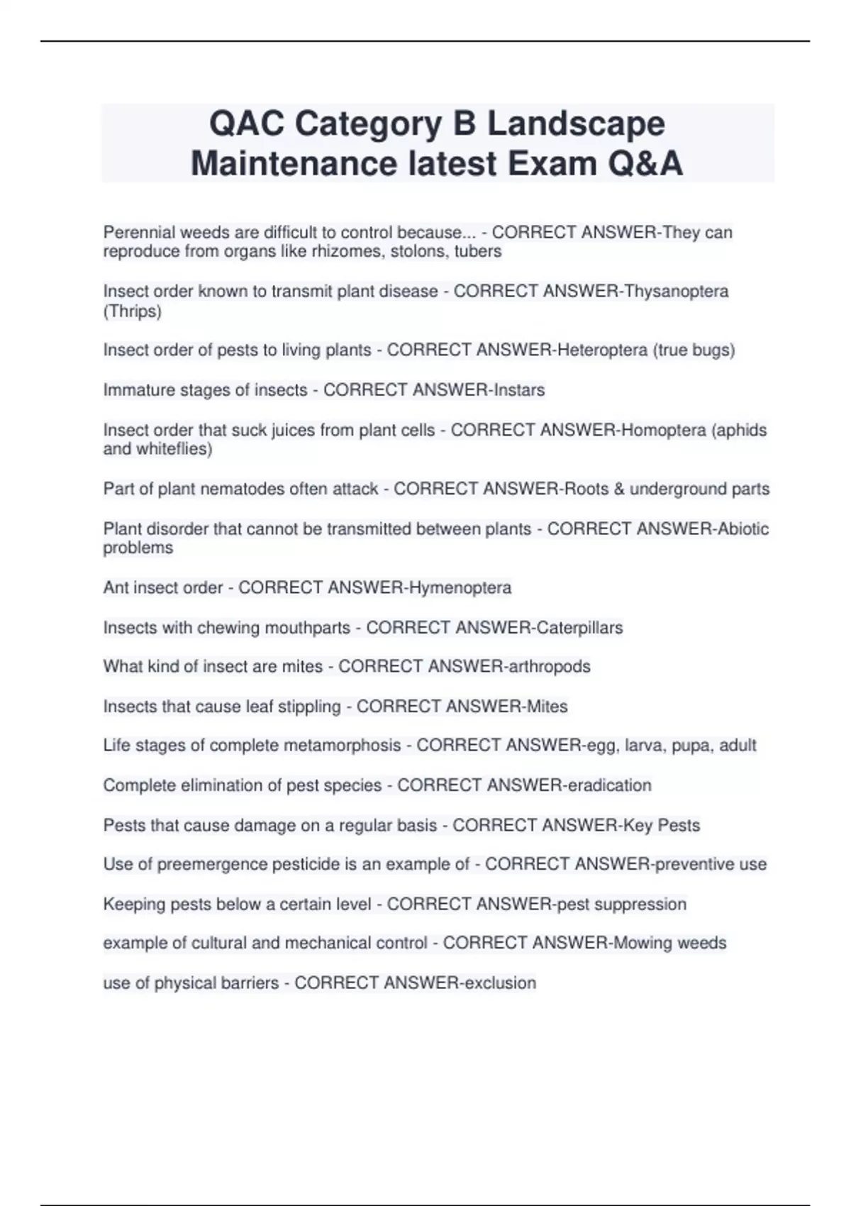 QAL B License Landscape Maintenance Pest Control Level 1 Updated Questions and Answers QAC Category B Landscape Maintenance latest Exam Q&A QAC Landscape and Maintenance Test Final Exam Latest Updated Landscape maintenance Pest control QAC Complete Exam *Q&A QAC Exam (Landscape and Maintenance) Verified Solutions Landscape Maintenance QAC Exam Q&A