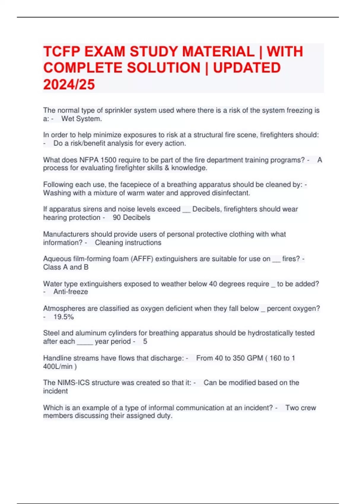 Exam (elaborations) TCFP EXAM STUDY MATERIAL | WITH COMPLETE SOLUTION | UPDATED 2024/25 2 Exam (elaborations) TCFP prep questions and answers | Latest 2024/25 | RATED A+ 3 Exam (elaborations) TCFP Exam Questions AND ANSWERS | With complete 2024/25 | 100% verified 4 Exam (elaborations) TCFP & GFD HAZMAT AWARENESS/OPS TEST | 100% VERIFIED 2024/25