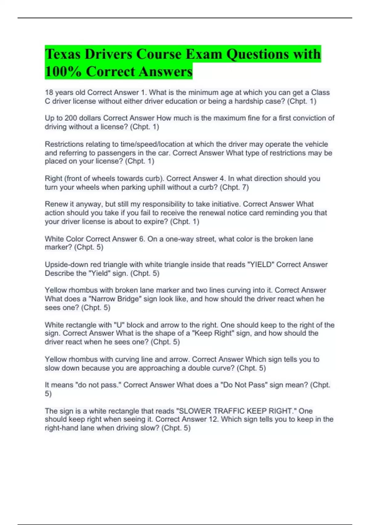 Texas Adult Drivers Education Course Questions with Correct Answers Texas Adult Drivers Education Course Questions with Correct Answers Texas Defensive Driving Exam Questions with Correct Answers Texas Driver s Ed –Questions with 100% Correct Answers Texas Drivers Course Exam Questions with 100% Correct Answers