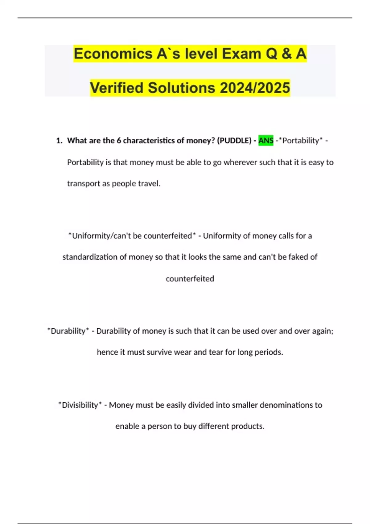 A Level Economics (AQA) ExamS Questions with Verified Solution PACKAGE DEAL