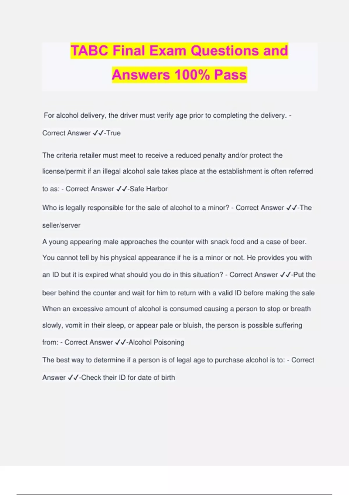 FINAL EXAM – TABC QUESTIONS AND ANSWERS 100% CORRECT
