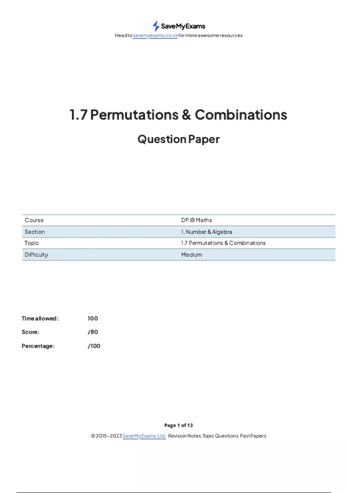 1.7 Permutations & Combinations Question Paper