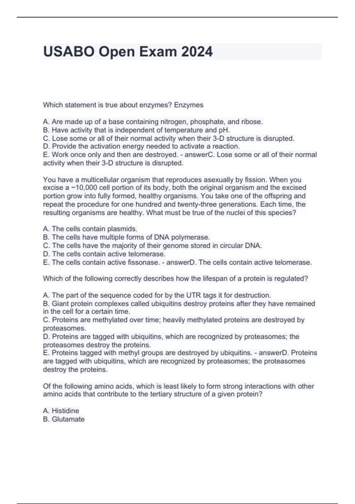 Exam (elaborations) USABO, Unit 5, Chapter 28 - Protists Questions and Answers 2024 Exam (elaborations) Amino Acids (Protein Modeling, USABO) Questions and Answers 2024 Exam (elaborations) USABO Open Exam 2024 A Questions and Answers Fully Solved Exam (elaborations) USABO Open Exam 2024 1B Questions and Answers Graded A+ Exam (elaborations