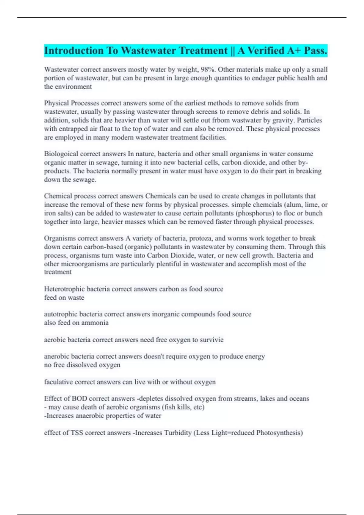 Water- Wastewater Test Hill Test 4 || Already Graded A+. Introduction To Wastewater Treatment || A Verified A+ Pass. Operation of Wastewater Treatment Plants (Levels 1-2 Exam Prep) || Questions and 100% Verified Answers. Operation of wastewater treatment plants || Already Passed. Sewage Treatment Worker Practice Test || with Errorless Solutions 100