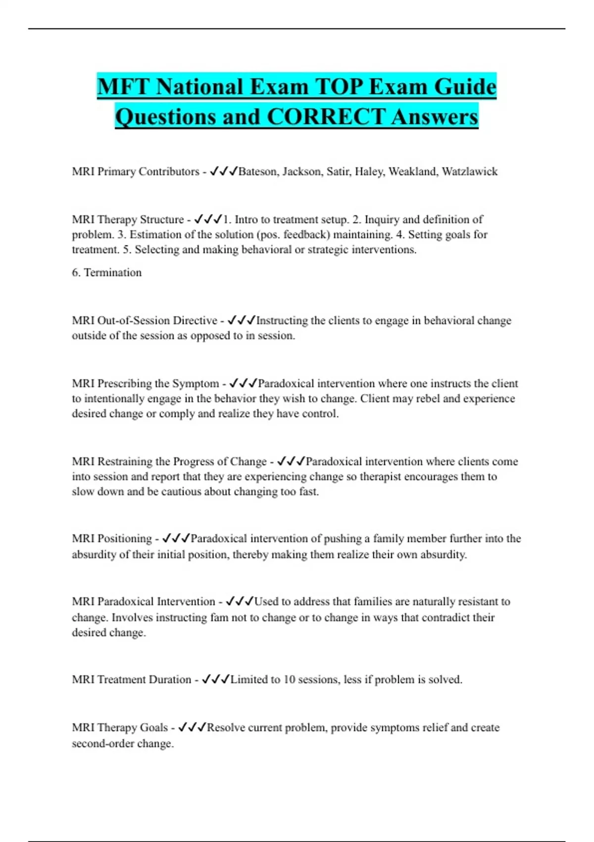 MFT National Exam Bundled Exam Questions Package with Correct Answers