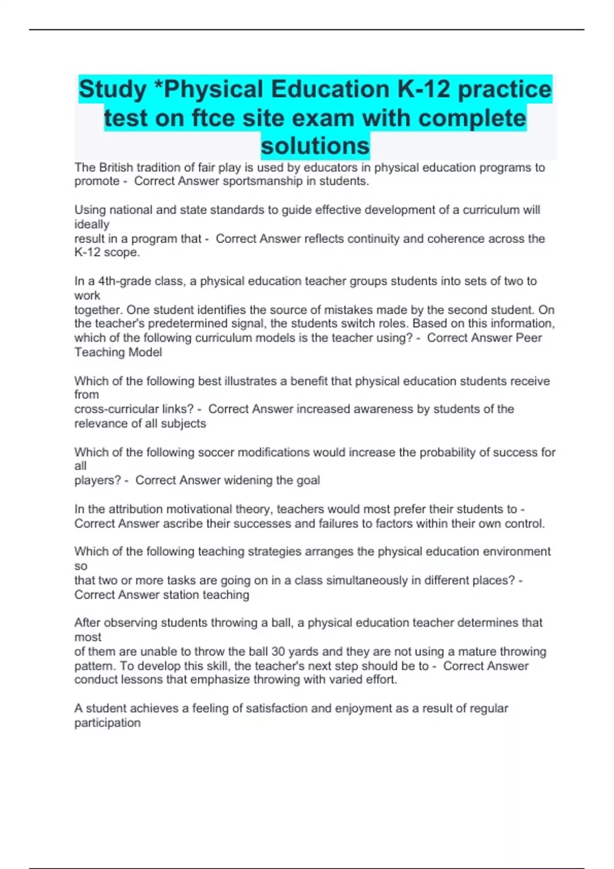 Study *Physical Education K-12 practice test on ftce site exam with complete solutions/Physical Education FTCE Exam Questions with Correct answers/FTCE Physical Education Certification Exam Questions With Complete Solutions/FTCE physical education exam questions with correct answers