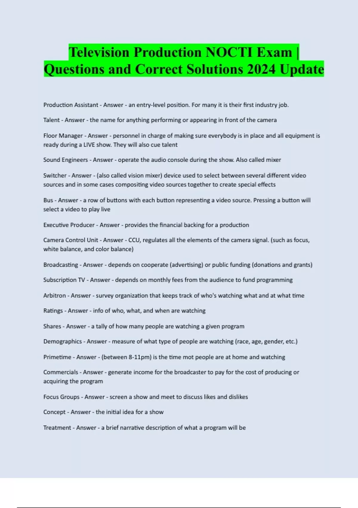 Bundle for NOCTI Exams Correctly Solved 2025 | 2026. Actual tests, Broadcast Video, Study guides, General Management exam review, Computer networking, culinary study, Electrical, Practice tests, sample questions and Answers, Television production, Information technology, Advertising and design, Graphics design