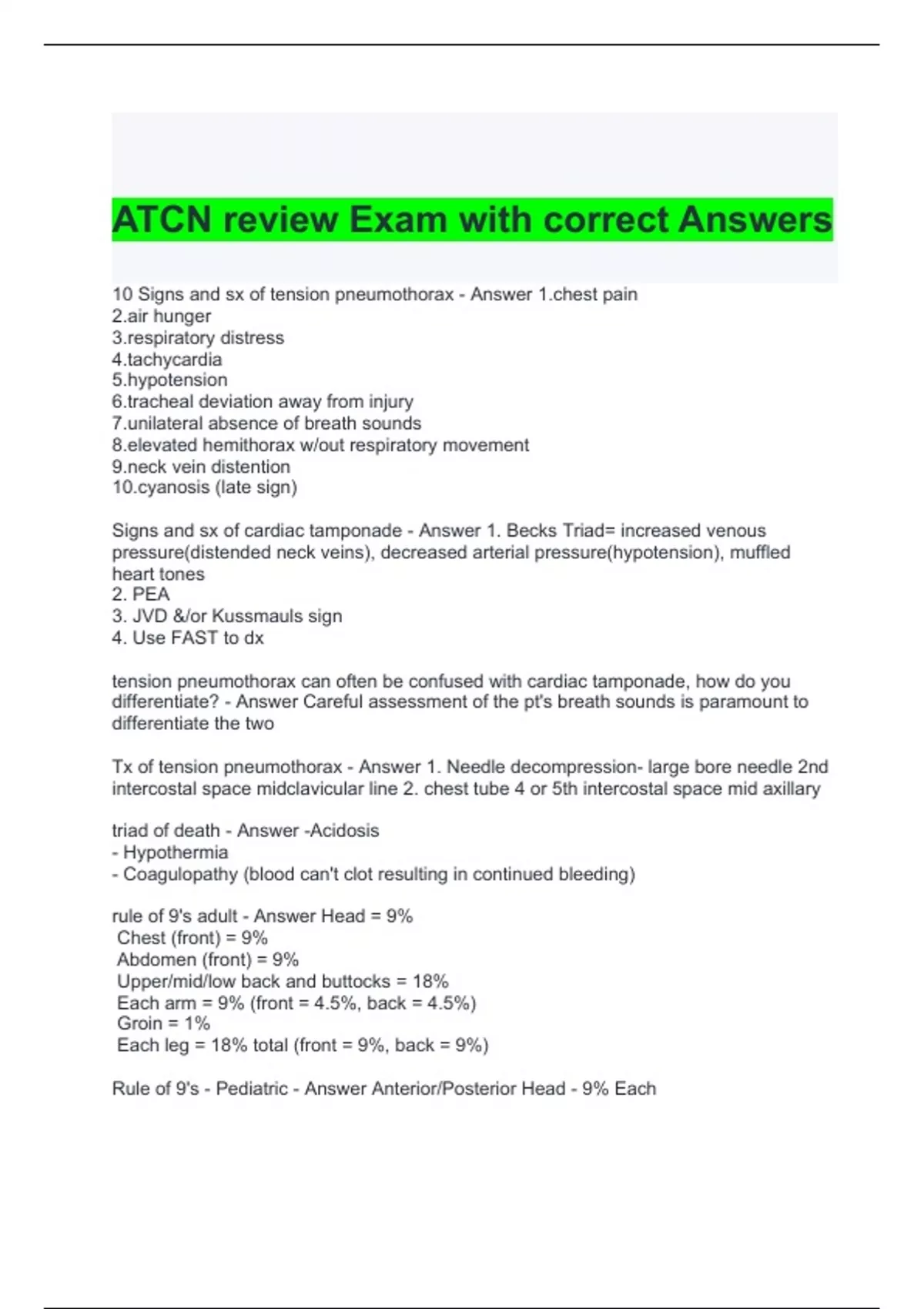 1 Exam (elaborations) ATCN review Exam with correct Answers 2 Exam (elaborations) ATCN review Exam Questions and Answers (Graded A) 3 Exam (elaborations) ATCN Pretest with correct Answers 4 Exam (elaborations) ATCN Exam with correct Answers 5 Exam (elaborations) ATCN Chapter 8 Musculoskeletal Trauma Exam Questions and Answers 6 Exam (elaborati