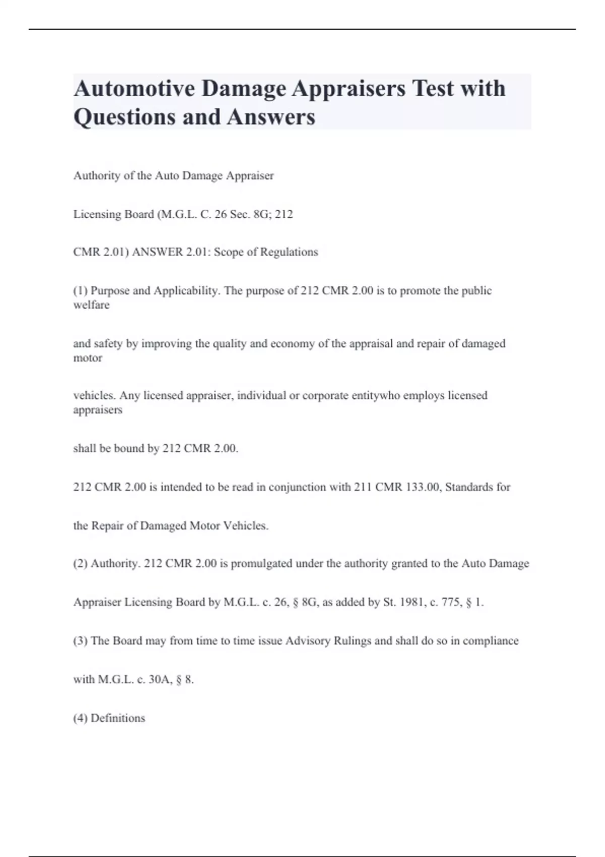 Auto damage appraisal Exam 1 with Questions and Answers Mass Automotive Damage Appraiser Exam with Questions and Answers Auto Damage Appraiser Exam with Questions and Answers Automotive Damage Appraisers Test with Questions and Answers