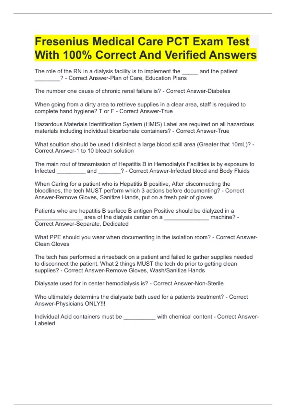 Fresenius Medical Care PCT Exam Test With 100% Correct And Verified Answers Fresenius PCT Exam With 100% Correct And Verified Answers Fresenius Exam With 100% Correct And Verified Answers Fresenius Training Exam With 100% Correct And Verified Answers Fresenius PCT Exam Prep For CCHT 2024 Part 2 With 100% Correct And Verified Answers
