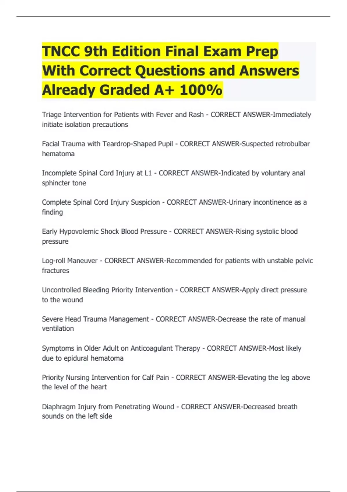 TNCC 9th Edition Final Exam Prep With Correct Questions and Answers Already Graded A+ 100%_ PACKAGE DEAL FOR EXCELLENCE