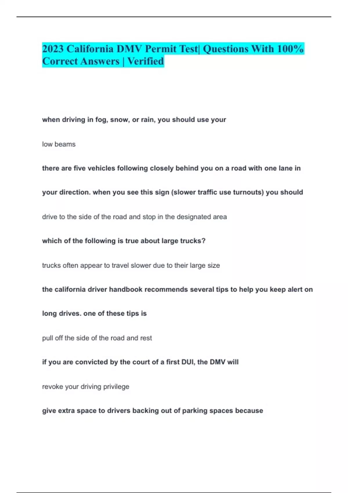 CALIFORNIA DMV PERMIT TEST 2024 EXAM QUESTIONS WITH COMPLETE SOLUTIONS VERIFIED