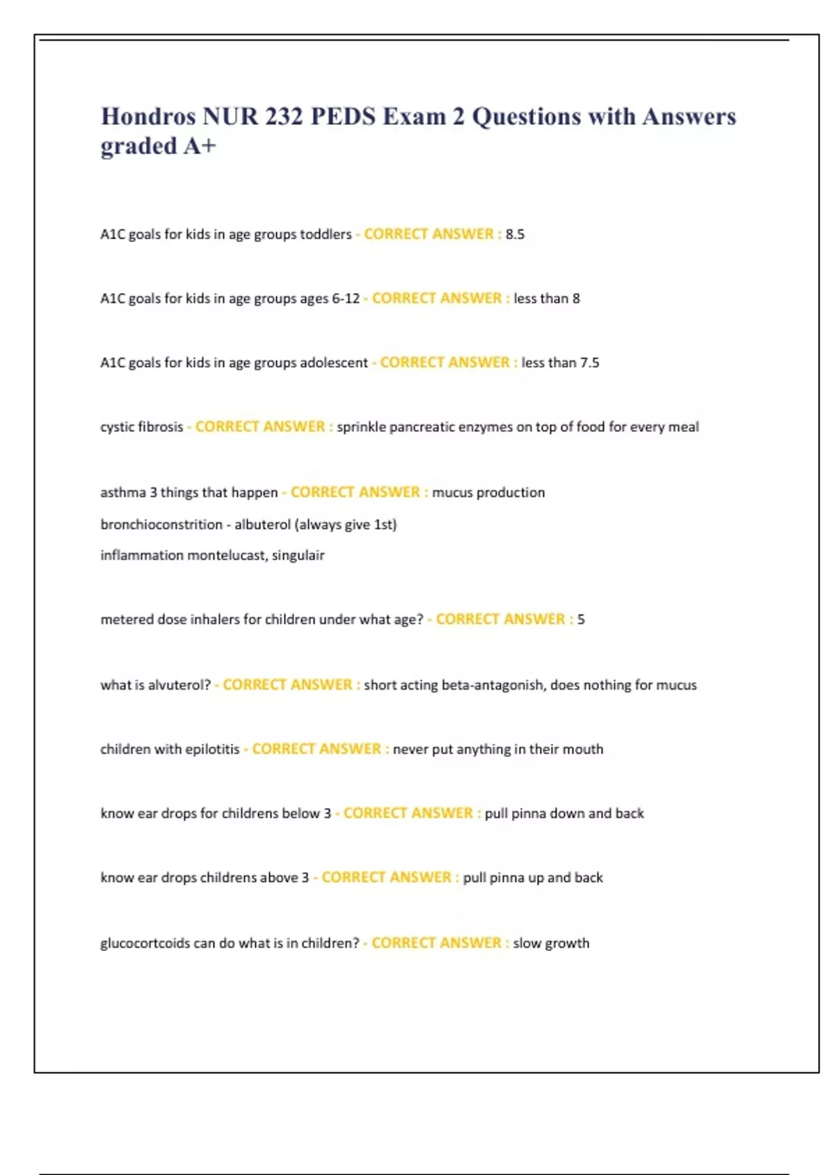 Hondros NUR 232 PEDS Exam 2 Questions with Answers graded A+
