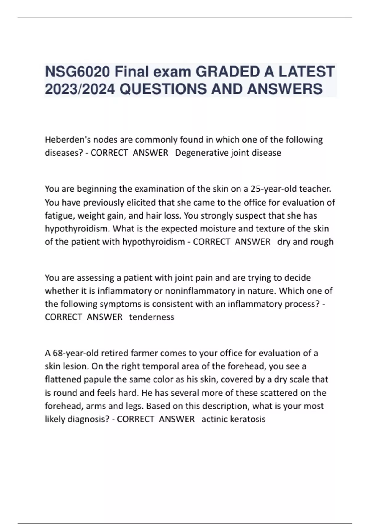 NSG6020 Final exam QUESTIONS ANSD ANSWERS GRADED A LATEST 2022/2024 2 Exam (elaborations) NSG6020 Final exam GRADED A LATEST 2023/2024 QUESTIONS AND ANSWERS