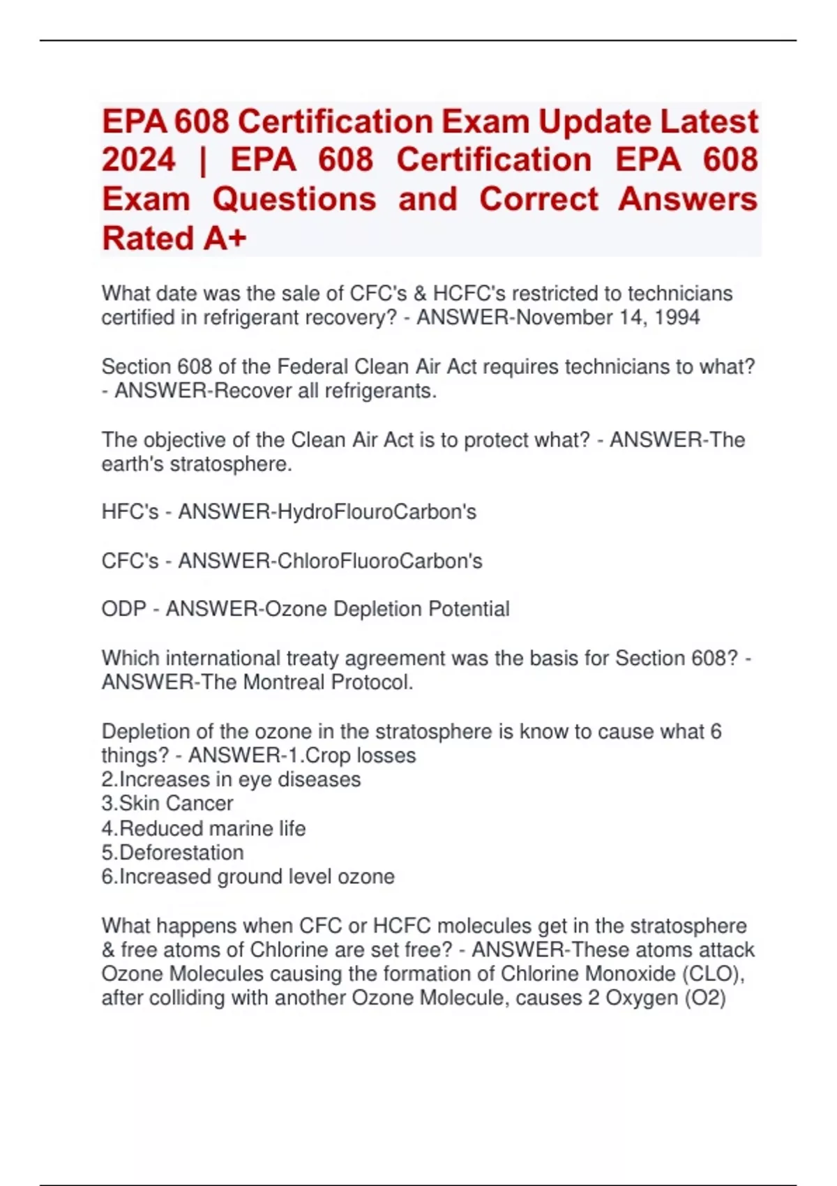 EPA 608 Certification Exam Update Latest 2024 | EPA 608 Certification EPA 608 Exam Questions and Correct Answers Rated A+