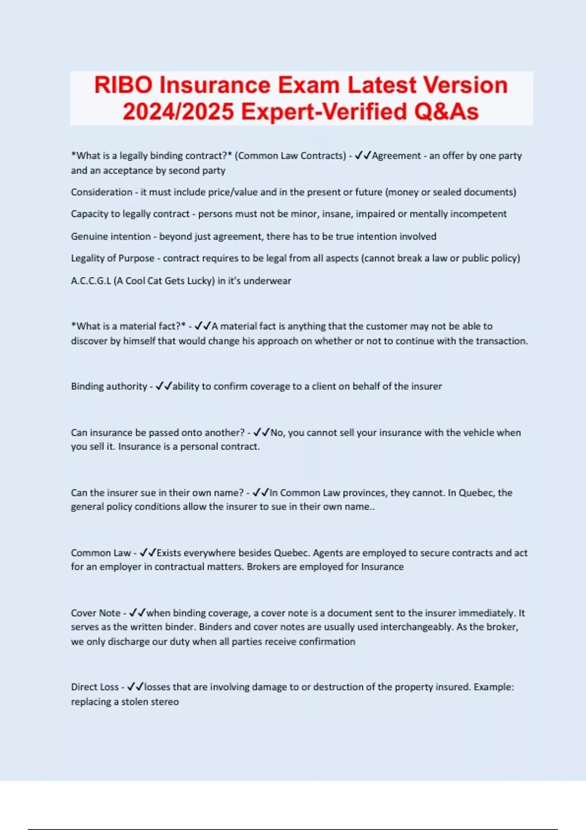 RIBO Insurance Exam Latest Version 2024/2025 Expert-Verified Q&As