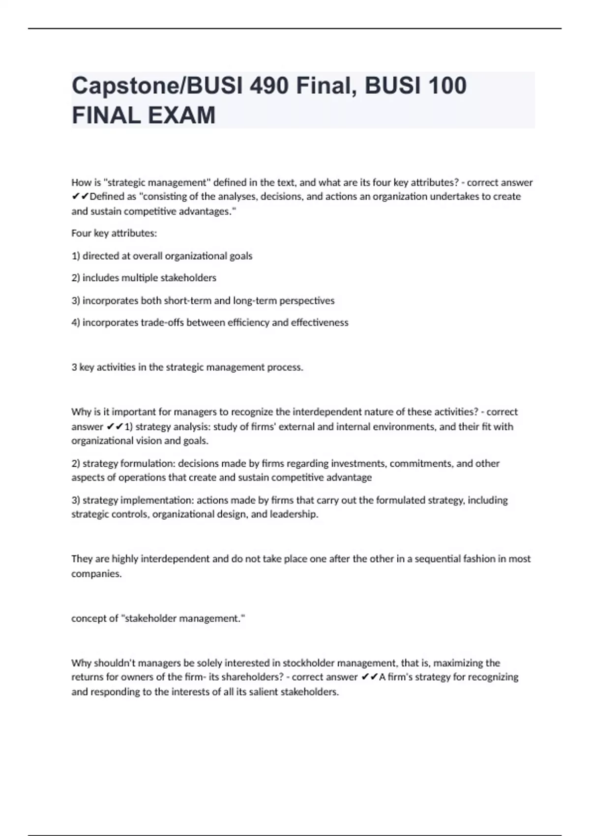 1 Exam (elaborations) BUS 490 Test 1 questions with 100% correct answers 2 Exam (elaborations) bus 490 final exam questions well answered 3 Exam (elaborations) BUSI 490 Key Points (Chapter 2) questions with answers