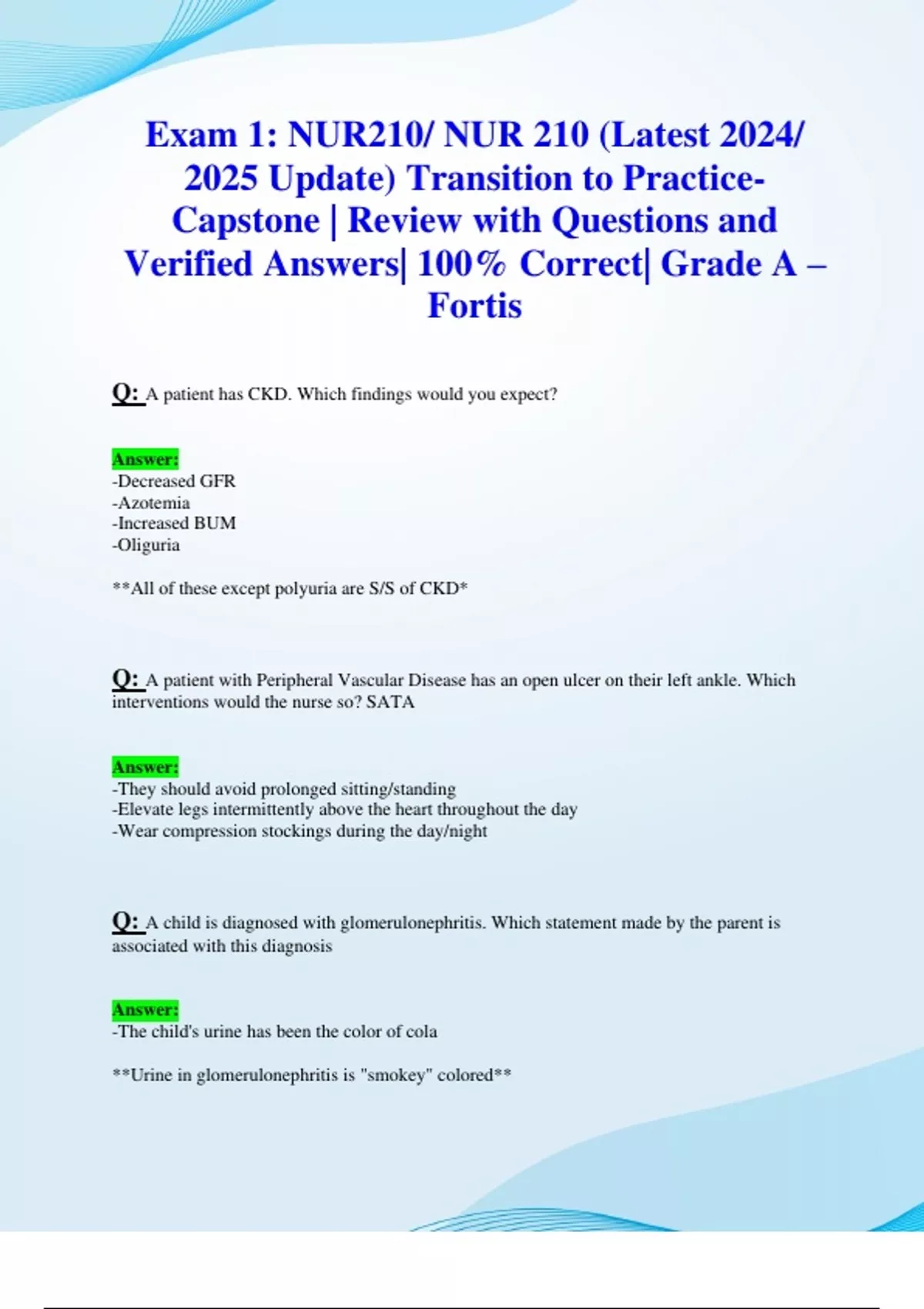 Exam 1: NUR210/ NUR 210 (2024/ 2025 Update) Transition to Practice-Capstone | Review with Questions and Verified Answers| 100% Correct| Grade A – Fortis