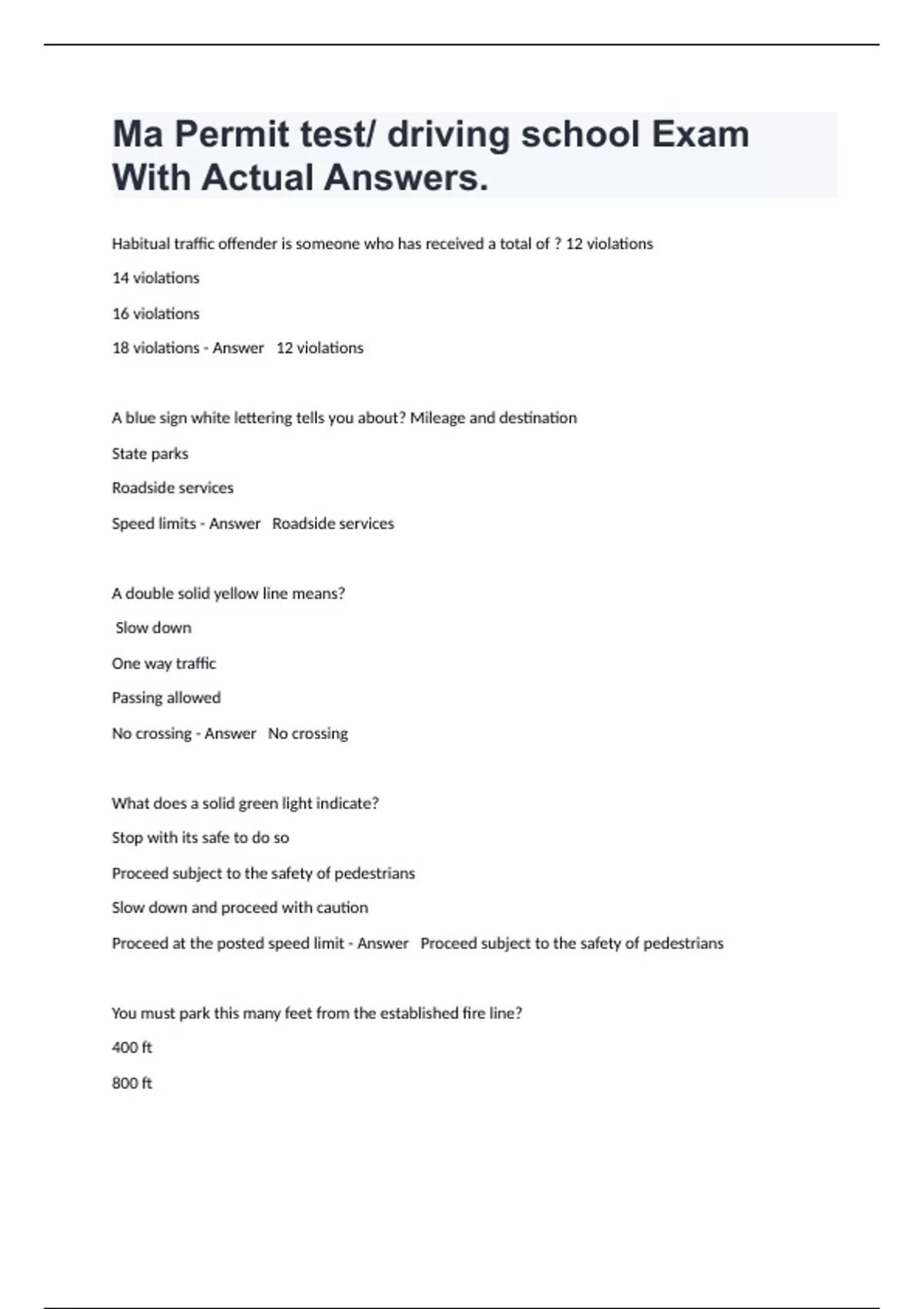 1 Exam (elaborations) Myers Driving Test Questions With All Correct Answers. 2 Exam (elaborations) TEXAS DRIVING SCHOOL FINAL EXAM AND VERIFIED ANSWERS. 3 Exam (elaborations) Tom s driving Test Study Guide Exam Guaranteed To Pass Solutions. 4 Exam (elaborations) Elite Driving School Driver Education Practice Exam With 100% Accurate Answers.