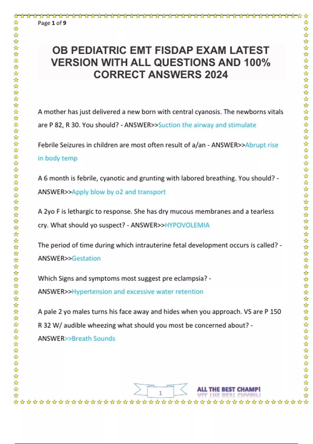 OB/PEDIATRIC EMT FISDAP LATEST EXAM 7 VERSIONS 1000+ QUESTIONS AND CORRECT ANSWERS (VERIFIED ANSWERS) AGRADE COMPLETE
