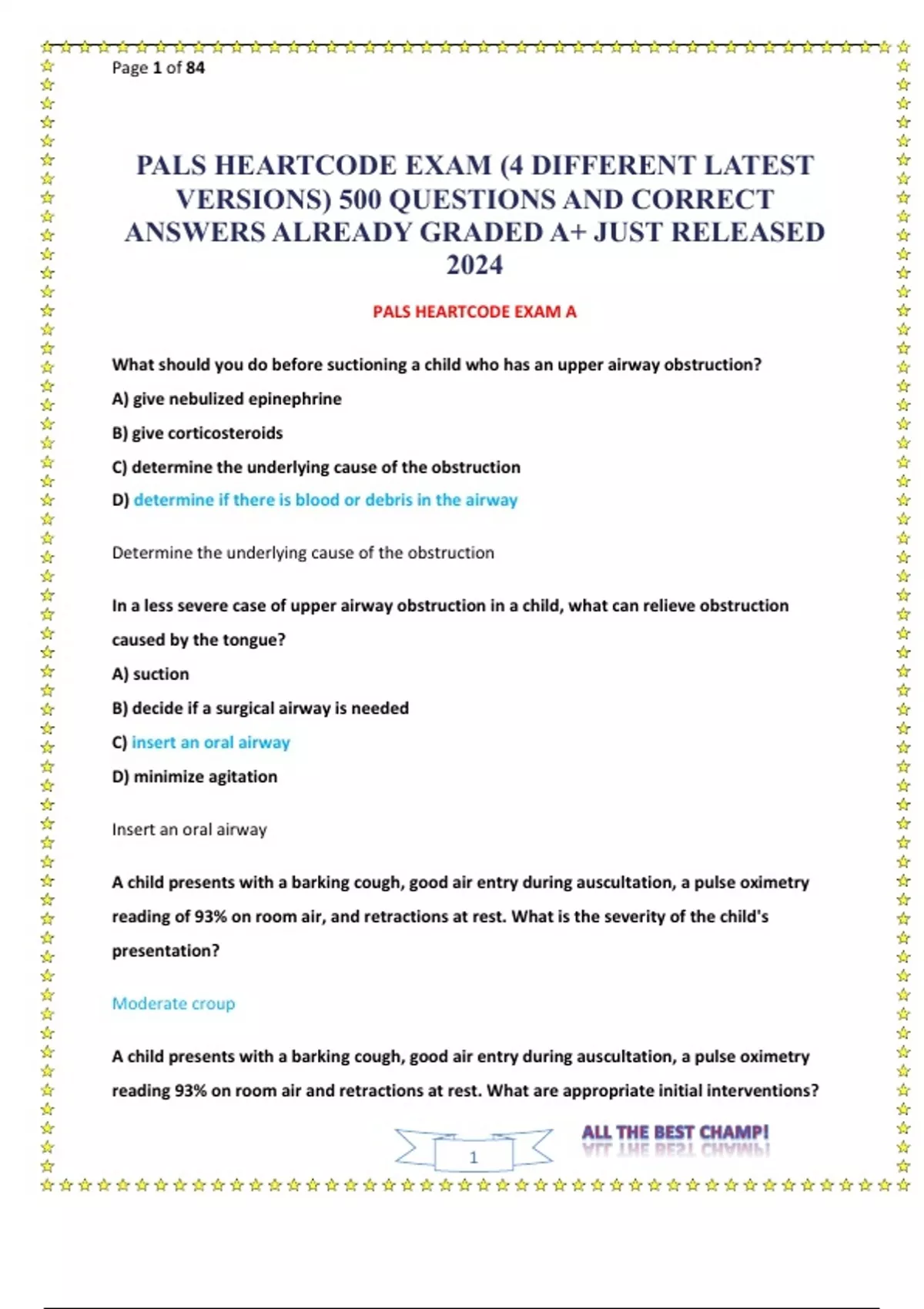 PALS HEARTCODE EXAM (7 DIFFERENT LATEST VERSIONS) ALL QUESTIONS AND CORRECT ANSWERS ALREADY GRADED A+ JUST RELEASED 2024