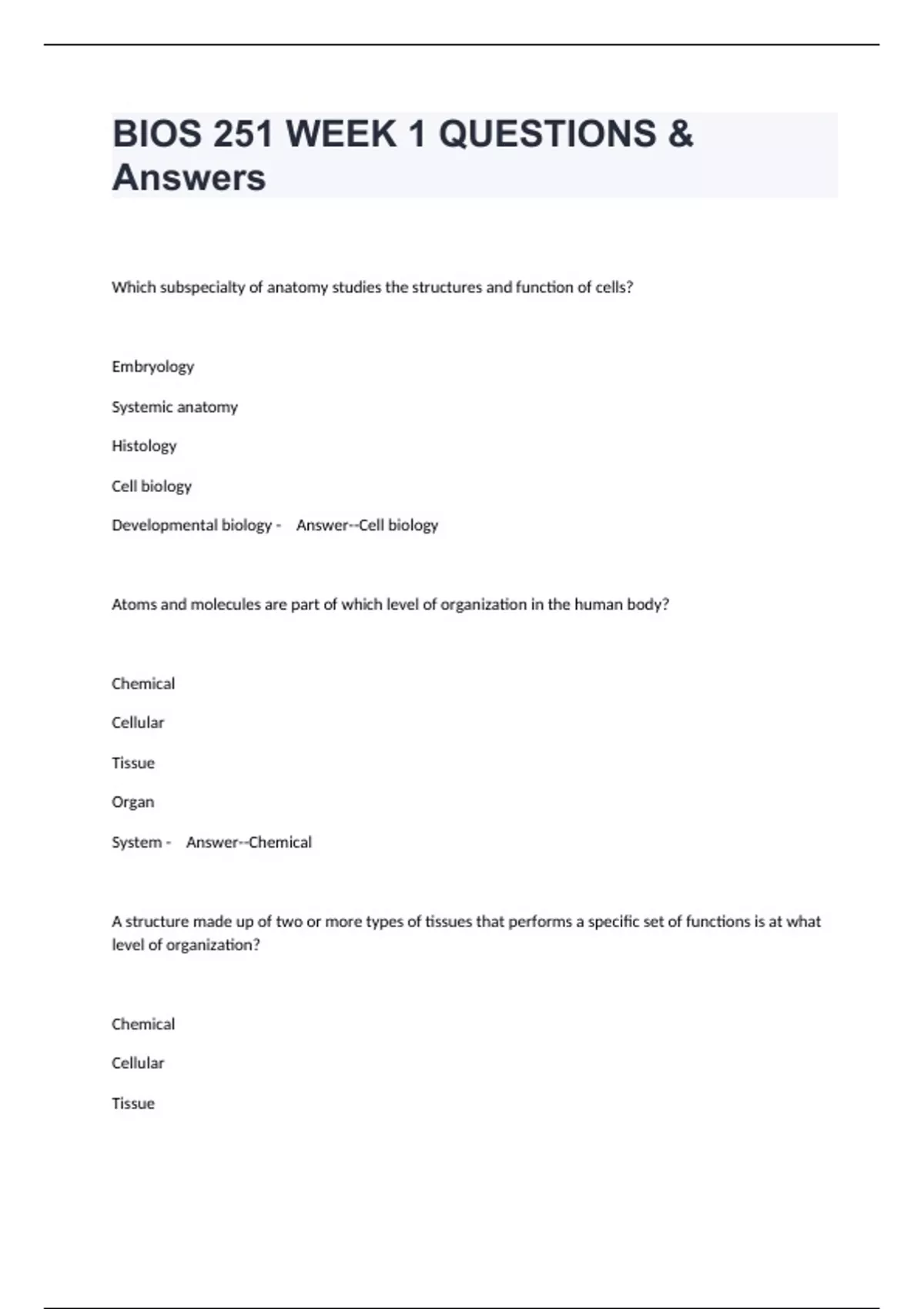 BIOS 251 WEEK 1 QUESTIONS & Answers
