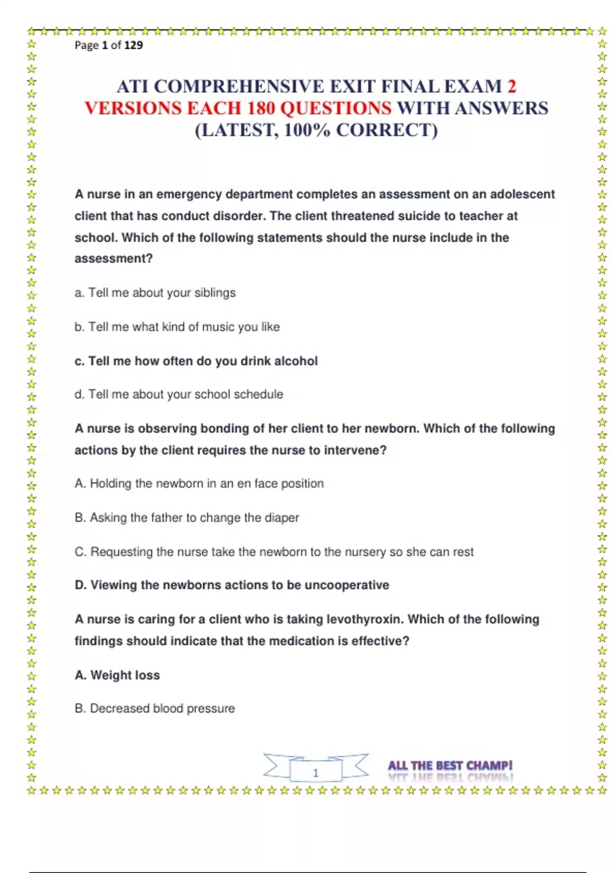 ATI COMPREHENSIVE PREDICTOR EXAM 2023 FORM A, B, C & D AND STUDY GUIDE-COMPREHENSIVE PREDICTOR 2023 FORM A, B, C & D LATEST COMPREHENSIVE PREDICTOR EACH FORM CONTAINS 180 QUESTIONS AND CORRECT ANSWERS.