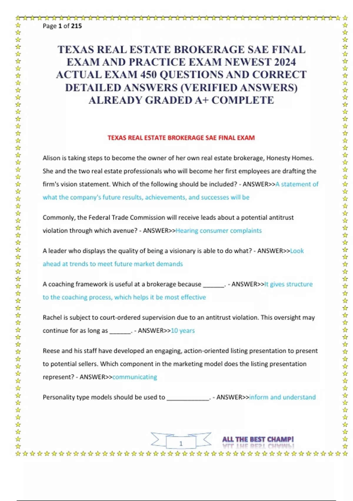 TEXAS REAL ESTATE BROKERAGE SAE FINAL EXAM AND PRACTICE EXAM NEWEST 2024 ACTUAL EXAM 450 QUESTIONS AND CORRECT DETAILED ANSWERS (VERIFIED ANSWERS) ALREADY GRADED A+ COMPLETE.