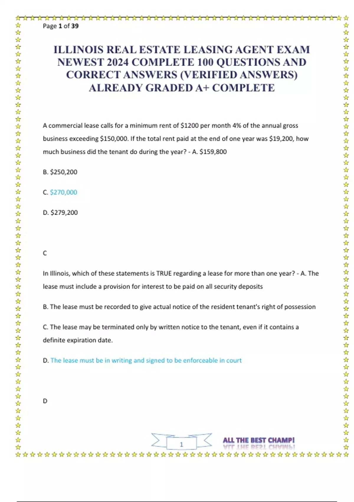 Illinois leasing agent practice exam Illinois Real Estate Leasing Exam Prep Latest Update Questions and Verified Correct Answers Guaranteed A+ complete
