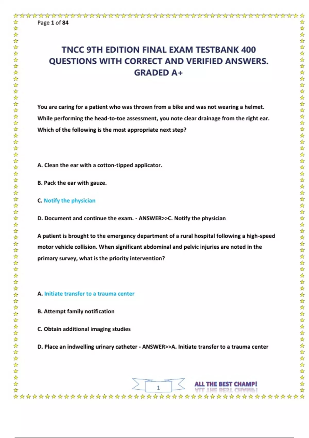 TNCC 9TH EDITION FINAL EXAM TESTBANK 400 QUESTIONS WITH CORRECT AND VERIFIED ANSWERS. GRADED A+