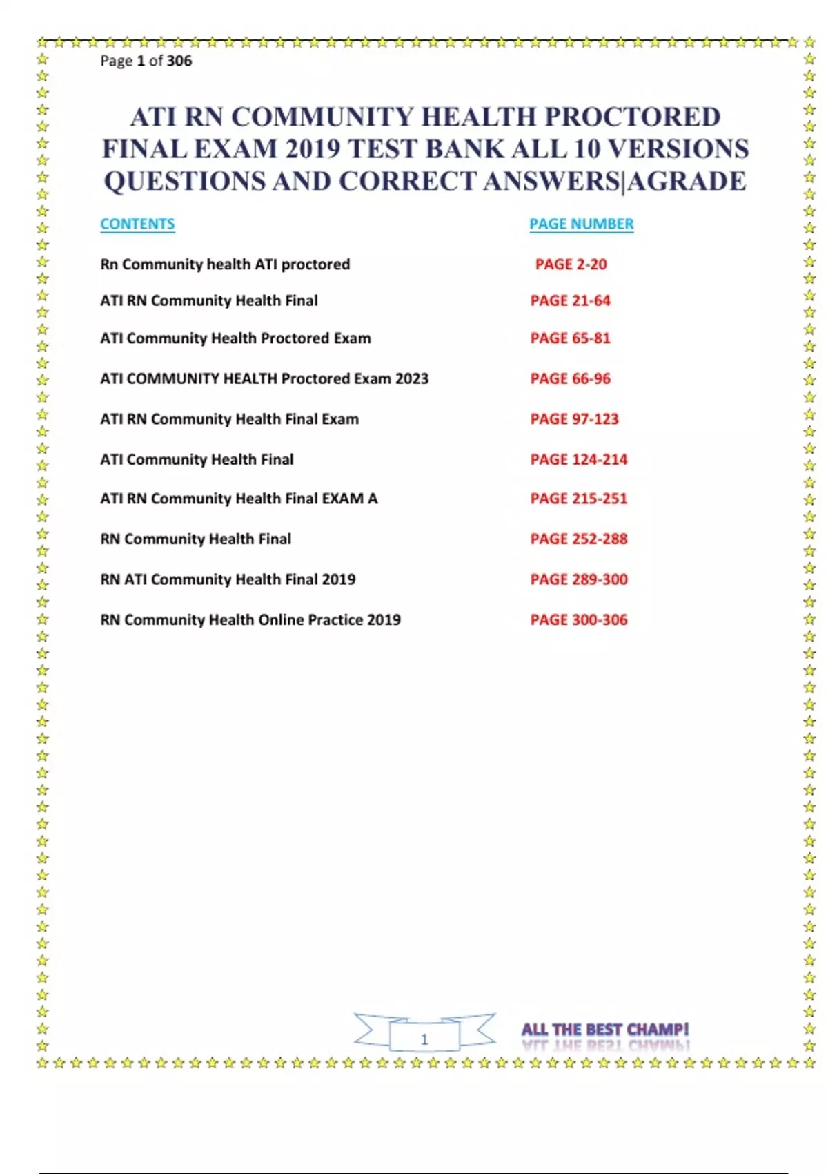 ATI RN COMMUNITY HEALTH PROCTORED FINAL EXAM 2019 TEST BANK ALL 10 VERSIONS QUESTIONS AND CORRECT ANSWERS AGRADE