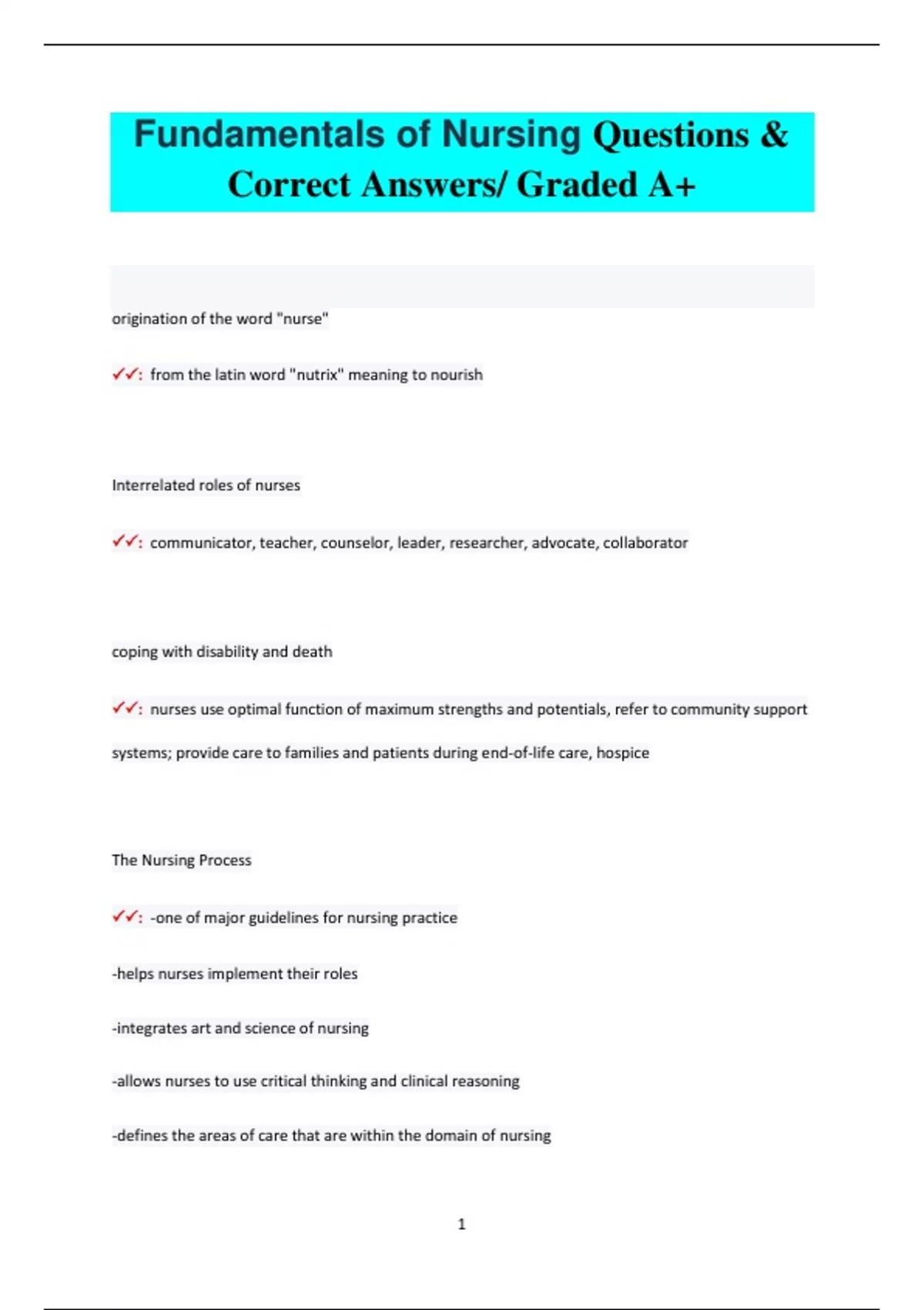 Fundamentals Of Nursing Questions & Correct Answers Pack / Graded A+