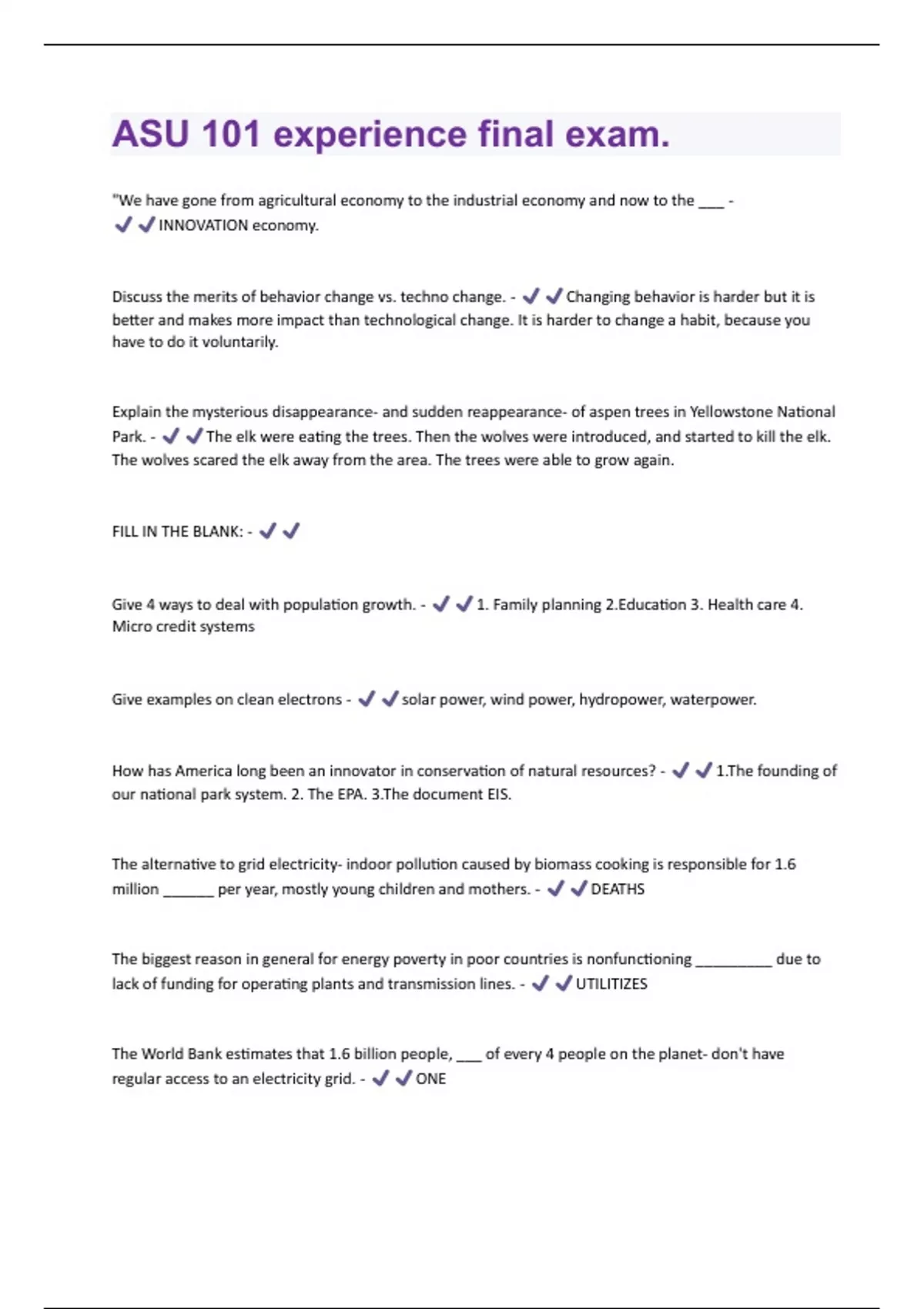 ASU 101 experience final exam(Questions + Answers) Verified 100% Correct!!.