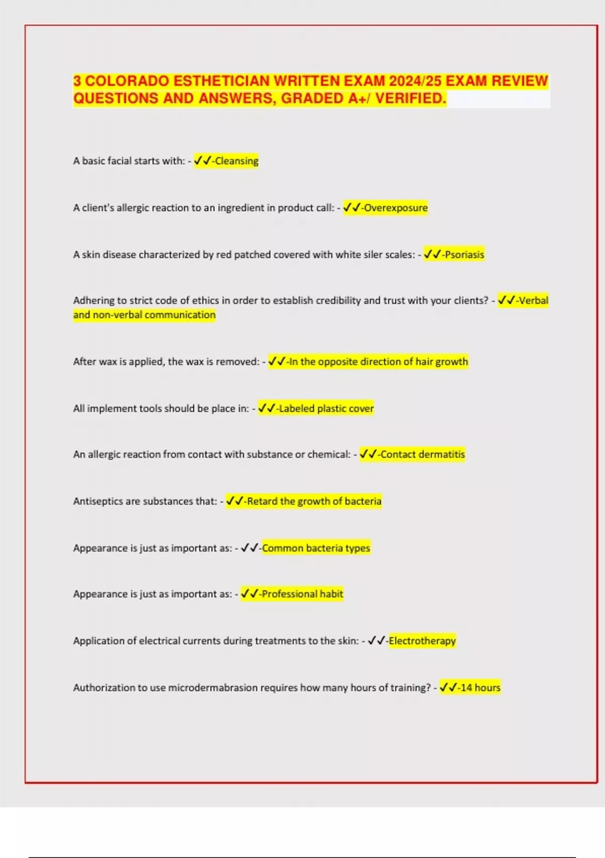 COLORADO ESTHETICIAN WRITTEN EXAM 2024/25 EXAM REVIEW QUESTIONS AND ANSWERS, GRADED A+/ VERIFIED.