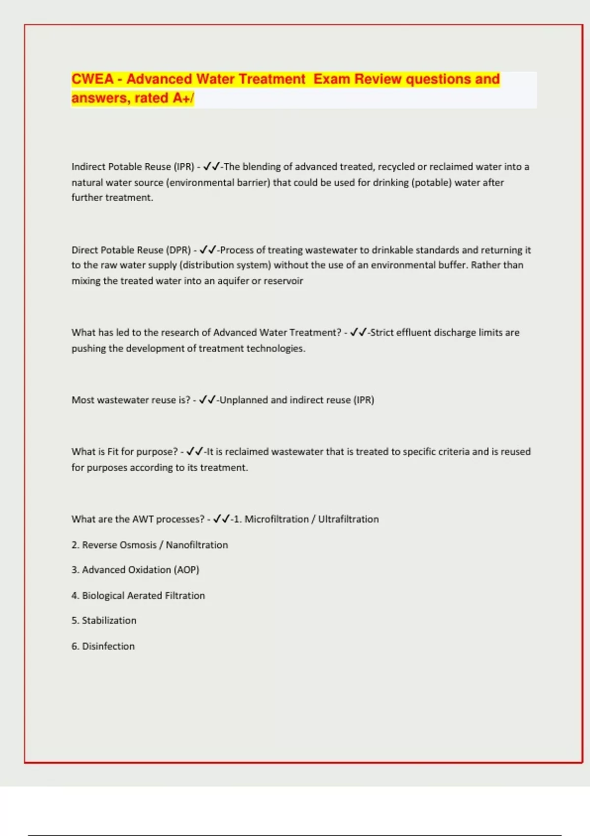 CWEA - Advanced Water Treatment Exam Review questions and answers, rated A+/