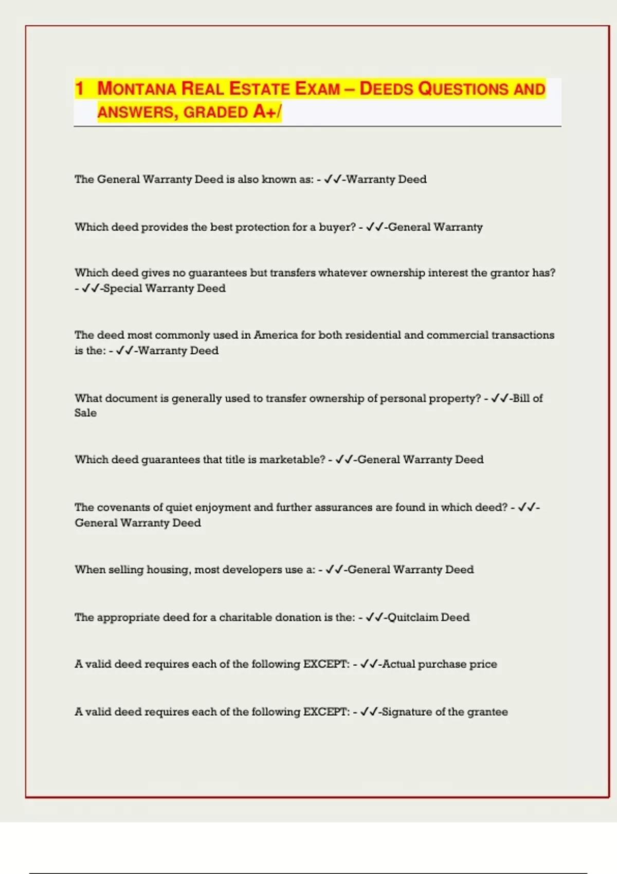MONTANA REAL ESTATE EXAM – DEEDS QUESTIONS AND ANSWERS, GRADED A+/[LATEST EXAM UPDATES]