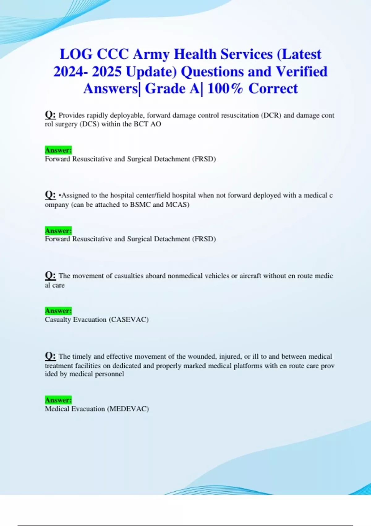 LOG CCC Army Health Services Exams (Latest Updates STUDY BUNDLE PACKAGE) Questions and Verified Answers| Grade A| 100% Correct