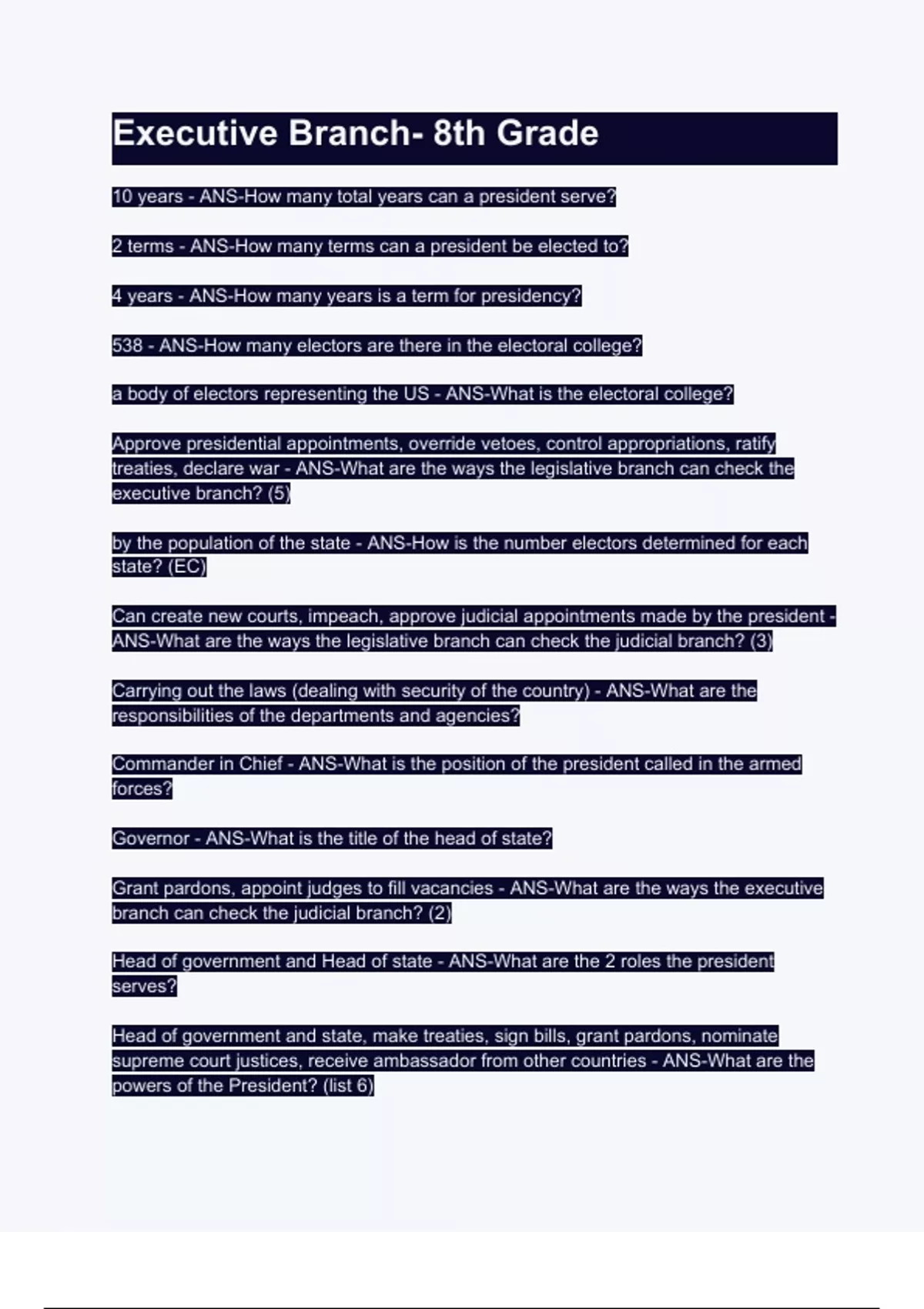 Executive Branch- 8th Grade Questions with 100% Actual correct answers | verified | latest update | Graded A+ | Already Passed | Complete Solution
