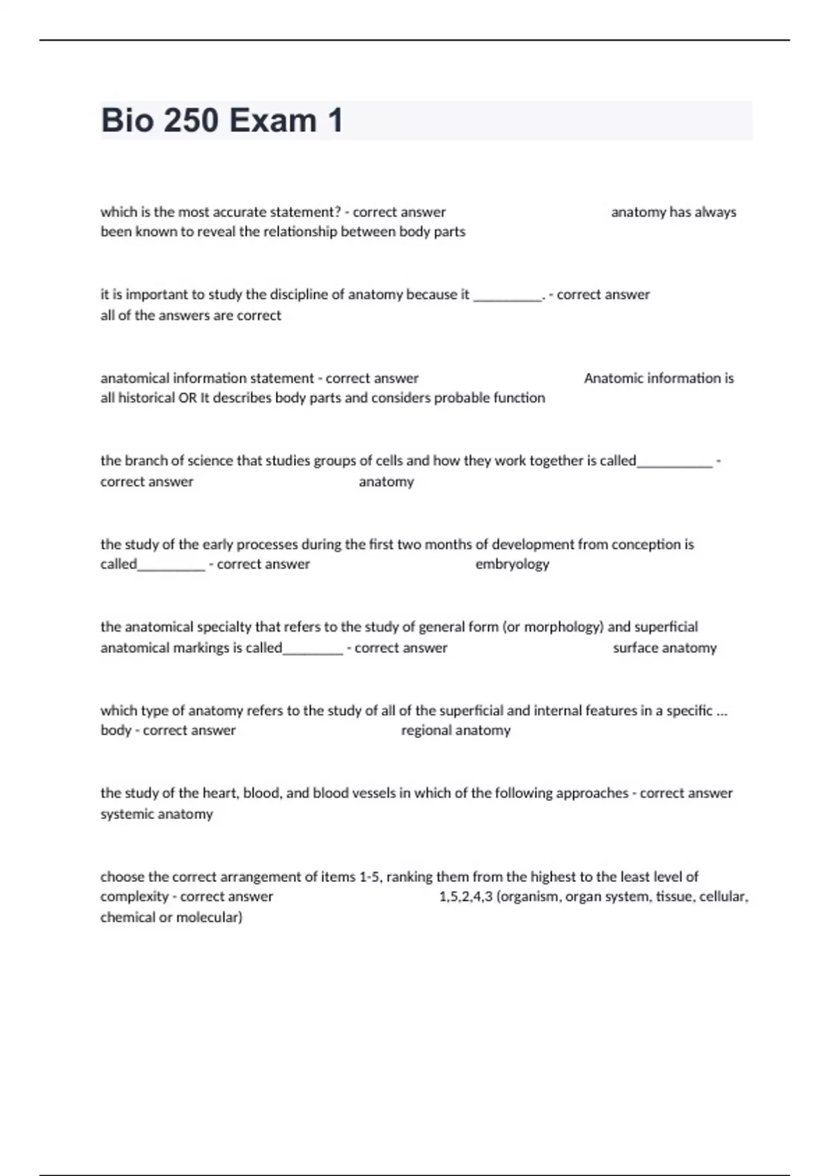 1 Exam (elaborations) BIO 250 Lecture exam Questions And 100% Verified Guaranteed Answers. 2 Exam (elaborations) Bio 250 Simu text notes (exam #1???) Already Answered Questions Graded A+. 3 Exam (elaborations) BIO 250 Exam 2 Complete Questions And Verified Detailed Answers. 4 Exam (elaborations) Bio 250 Midterm Exam Questions And Well Elaborated