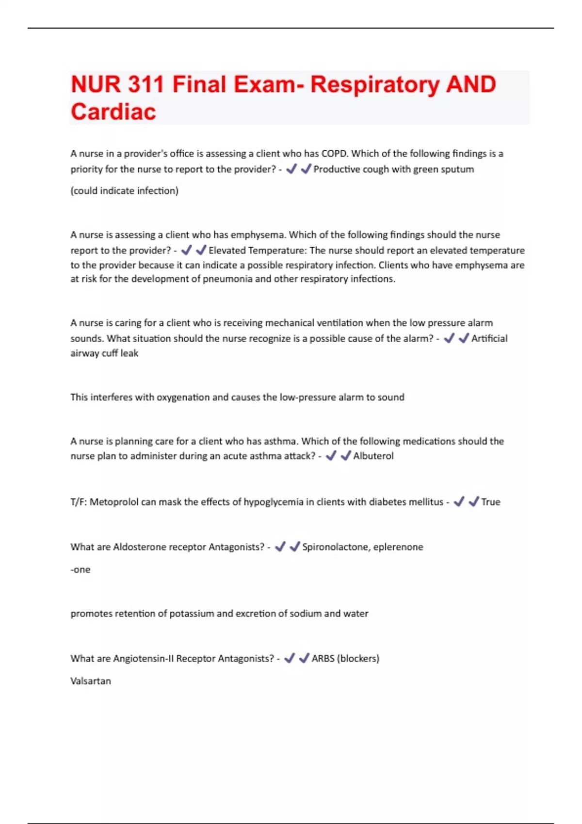 NUR 311 Final Exam- Respiratory AND Cardiac Questions With 100% Correct Answers.
