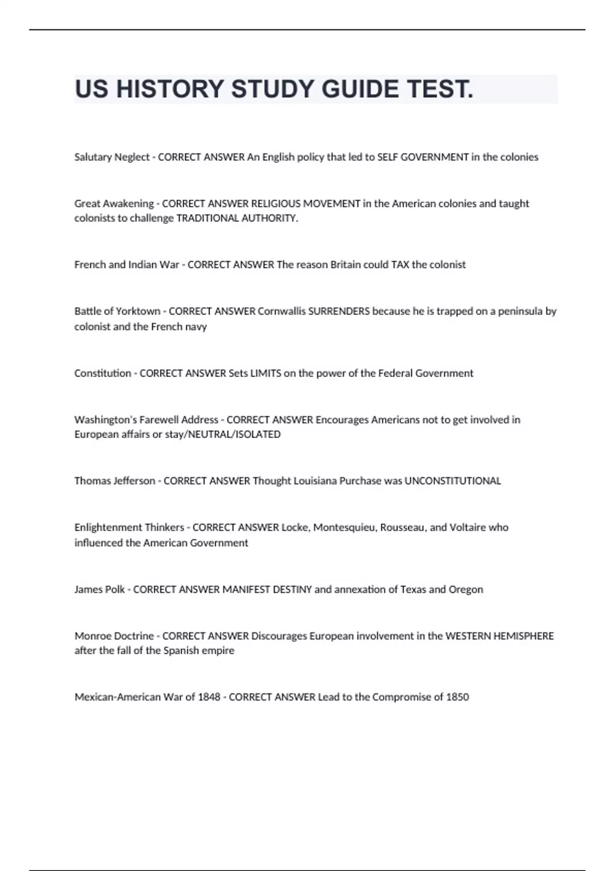 US HISTORY STUDY GUIDE BUNDLE PACK CORRECTLY SOLVED.