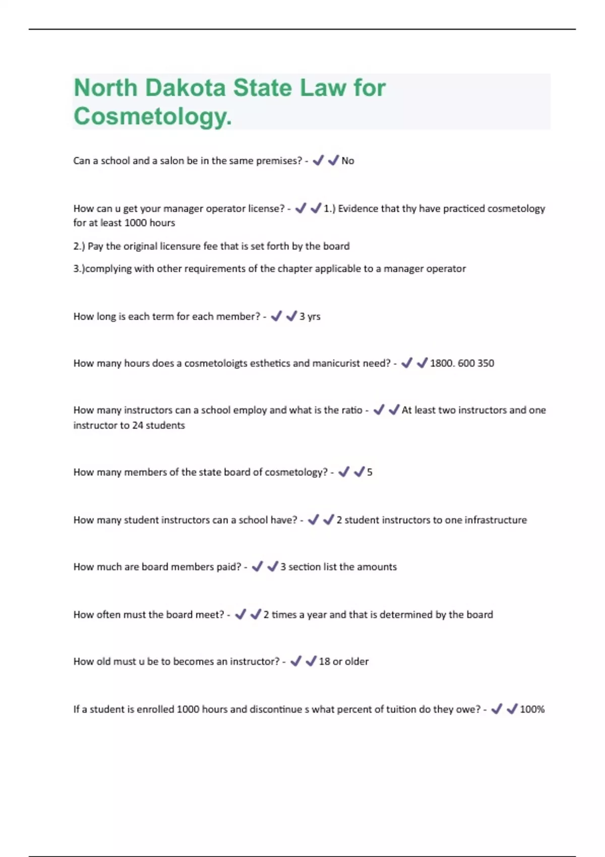 North Dakota State Law for Cosmetology Questions And Answers Rated A+