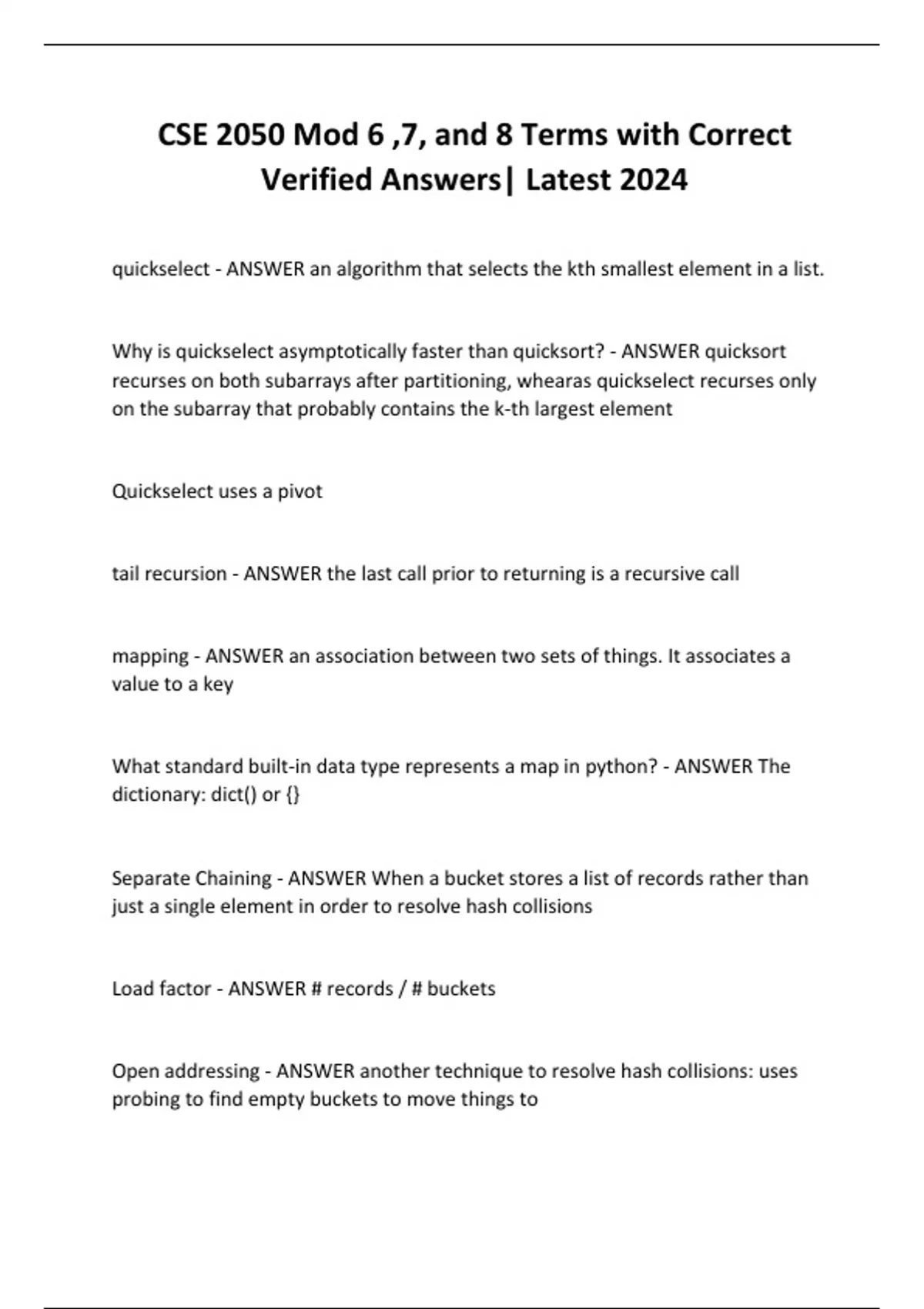 CSE 2050 Exam 2 - Recursion, Sorting, and Hashing with Correct Verified Answers| Latest 2024