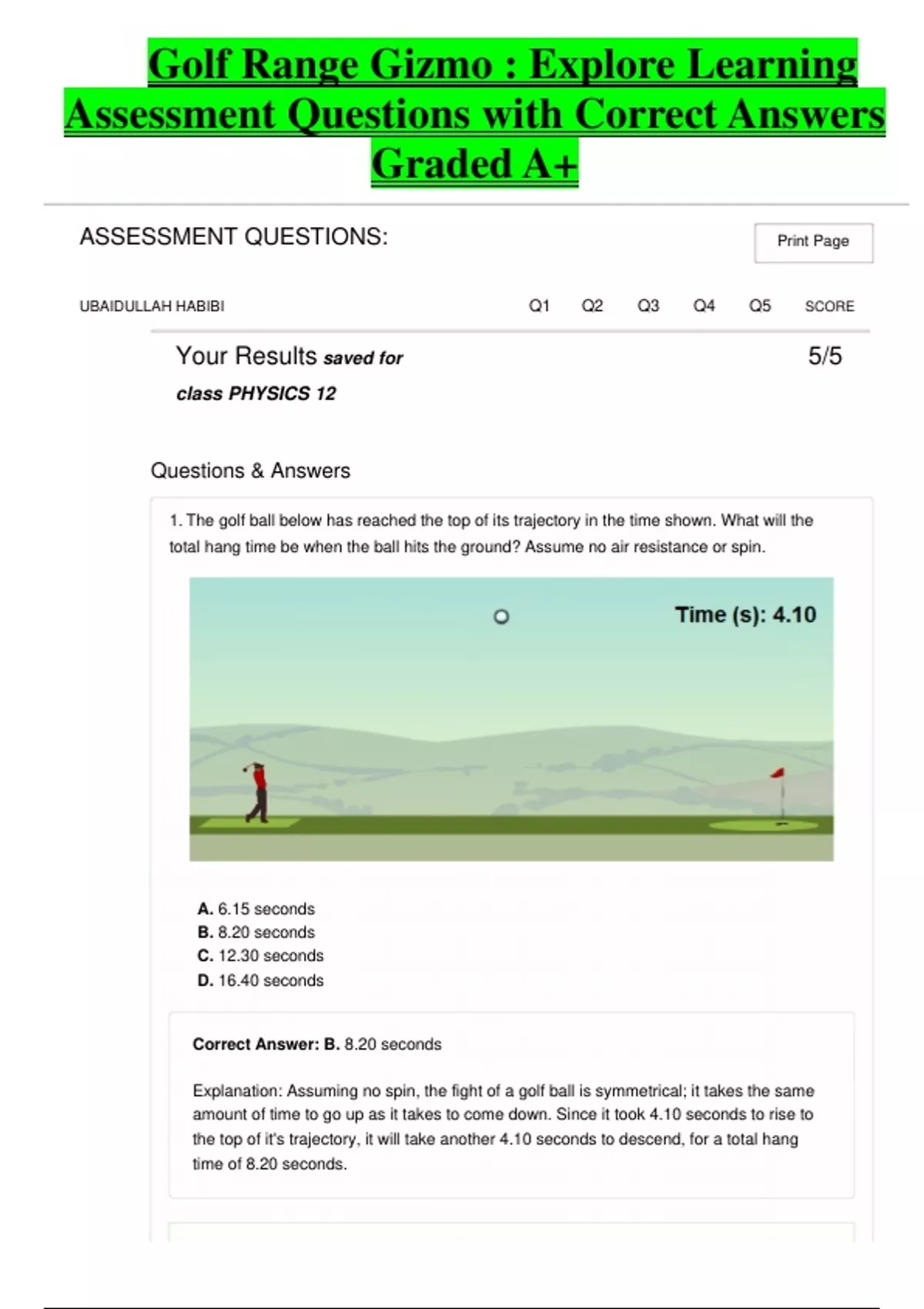 Golf Range Gizmo : Explore Learning Assessment Questions with Correct Answers Graded A+