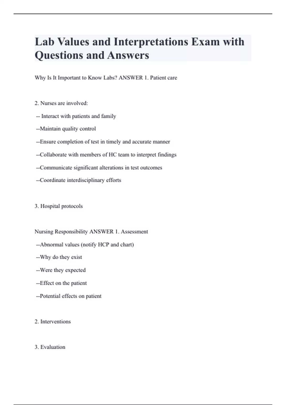 Lab Values Exam with Questions and Answers Lab Values Test Prep with Questions and Complete Solutions Lab values and Interpretation Exam 1 with Questions and Answers NCLEX-RN: Lab Values and Interpretation Exam with Questions and Answers Lab Values and Interpretation Test with Questions and Answers Lab Values and Interpretation Quiz with Questions