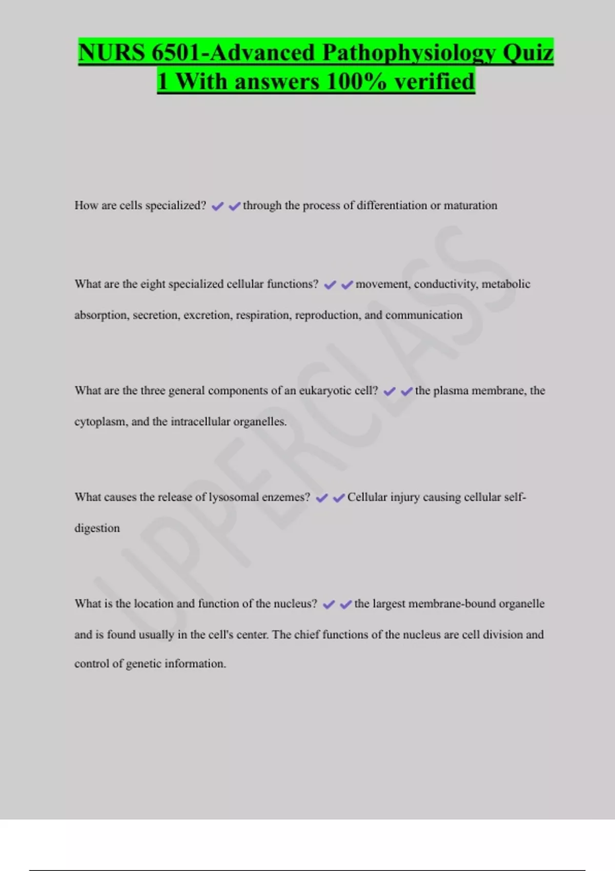 NURS 6501-Advanced Pathophysiology Quiz 1 With answers 100% verified 2 Exam (elaborations) NURS 6501 Mod 1-4 Exam Questions With Complete Solutions 3 Exam (elaborations) NURS 6501-Advanced Pathophysiology Quiz 1 exam with solutions