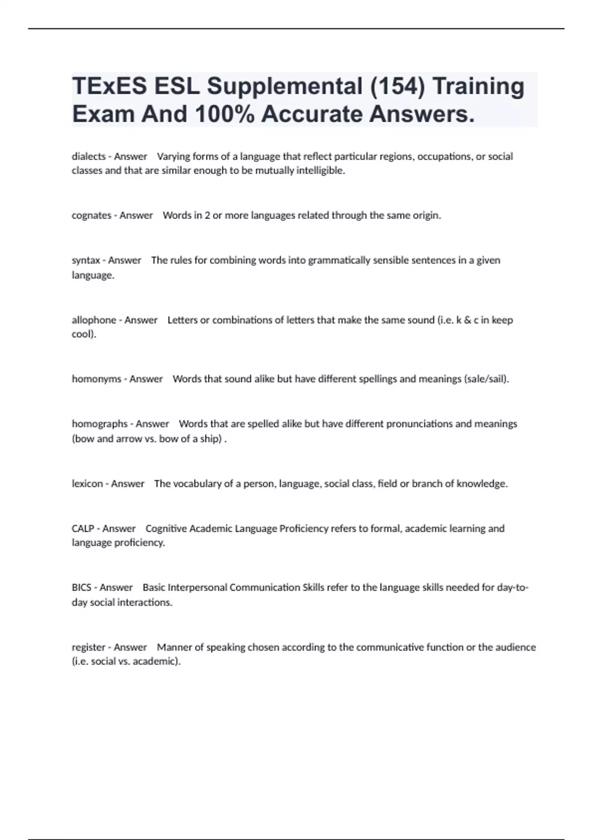 1 Exam (elaborations) ESL 154 Practice Test Questions With All correct Answers. 2 Exam (elaborations) ESL Supplement 154 Court Cases Final Exam And Correct Answers. 3 Exam (elaborations) TeXes ESL Supplemental 154 Exam Vocabulary Questions Fully Solved.