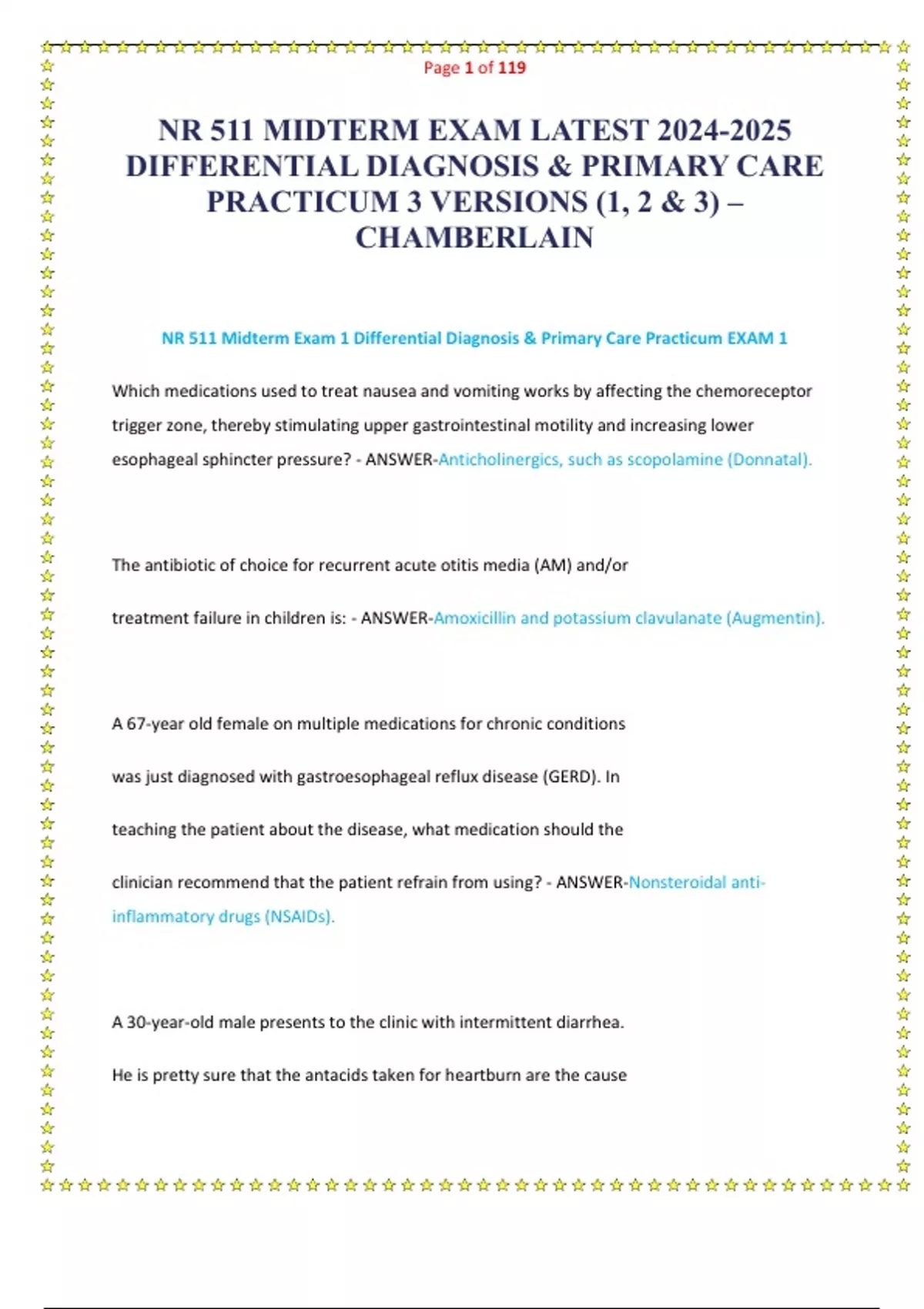 NR 511 MIDTERM EXAM LATEST ACTUAL EXAM QUESTIONS AND ANSWERS DIFFERENTIAL DIAGNOSIS & PRIMARY CARE PRACTICUM EXAM (1, 2, 3 & 4) – CHAMBERLAIN