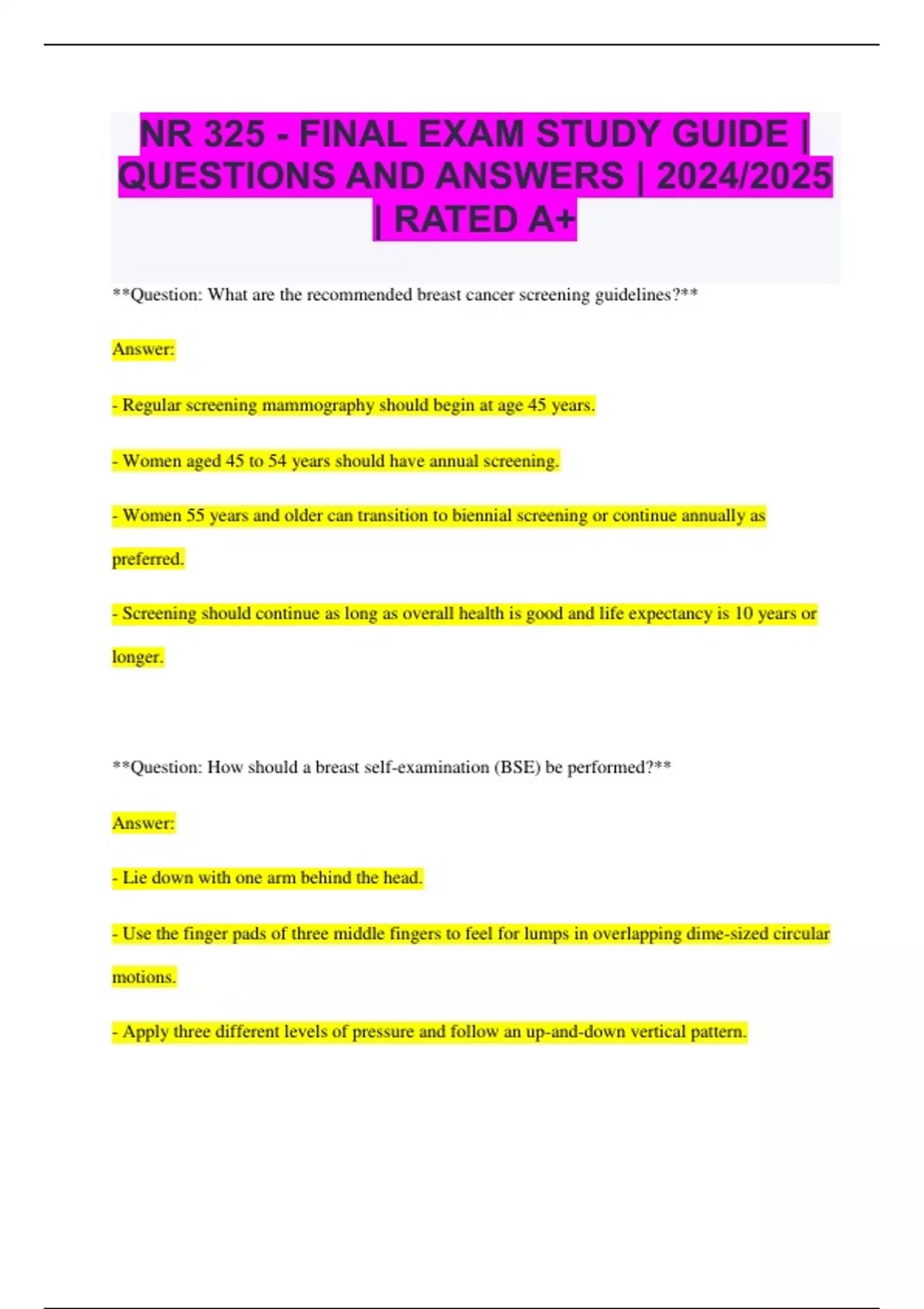 NUR 325 Bundled Exams Questions and Answers Latest Versions (2024/2025) (Complete and Accurate)