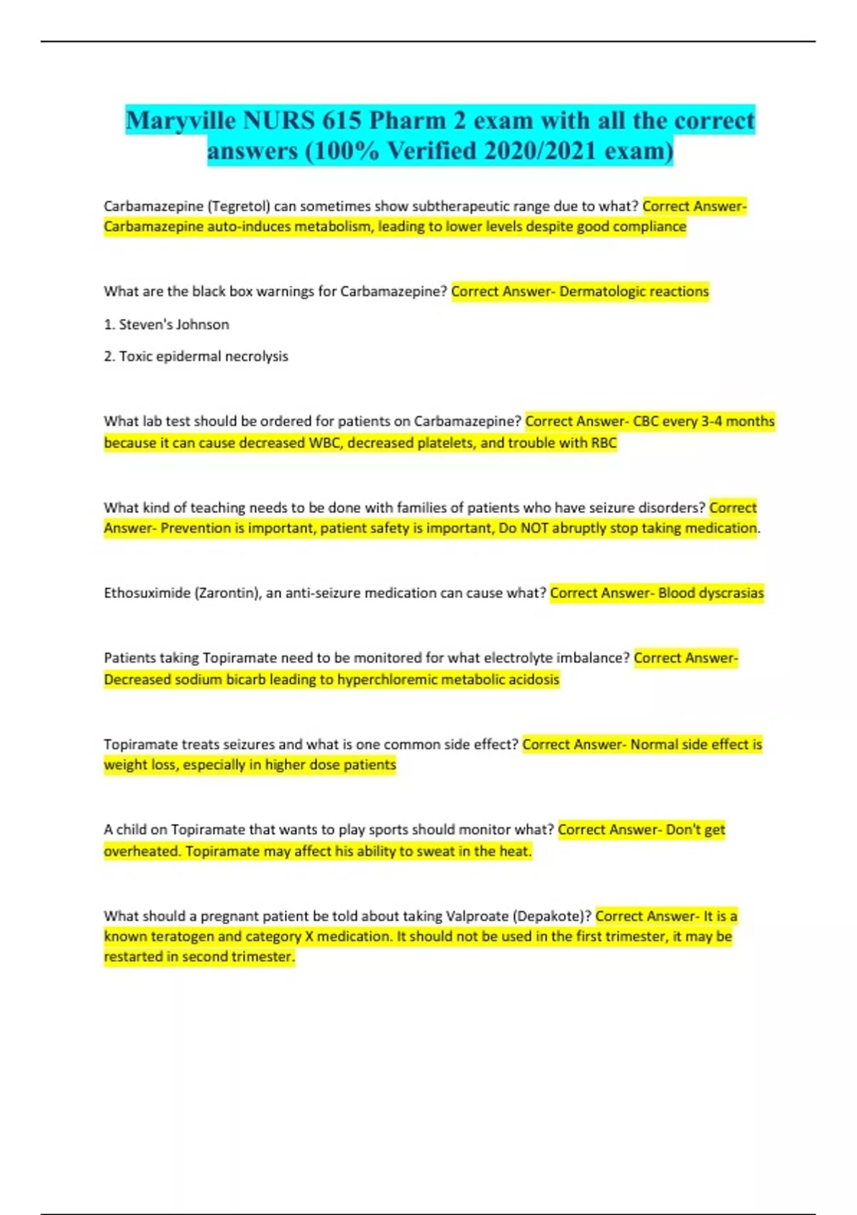 Maryville NURS 615 Pharm 2 exam with all the correct answers |100% Verified 2022/2023 exam